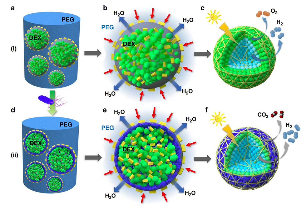 The researchers discovered a breakthrough: photobiological production of hydrogen under aerobic room temperature conditions with water emulsion using minimal mass, energy, and local resources. After mixing BSA (Bovine serum albumin) hydrogel microparticle stabilizer with a solution of chlorella cells, the hydrophilic micro-droplets captured high loadings of photosynthetic algae cells by emulsification. This solution was then injected into a mixture of rapidly stirred PEG solution to produce 50% w/w emulsion.